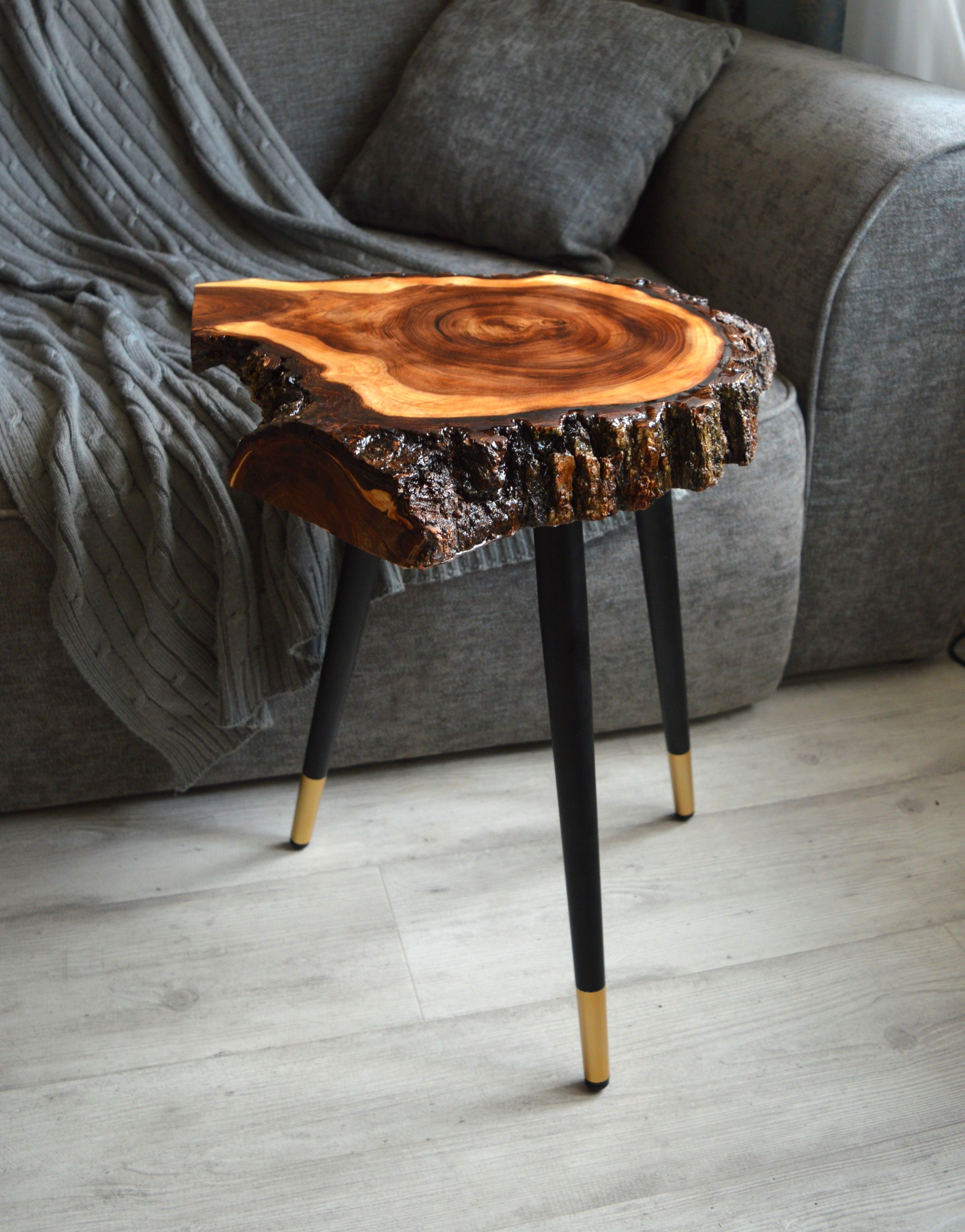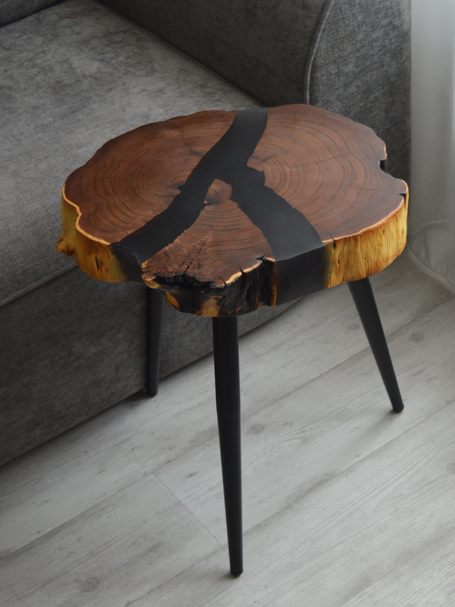 Столик из спила карагача и эпоксидной смолы, диаметр от 35-37 см, высота 58 см. Приставное подстолье на плоской ножке подойдет для любой мебели.