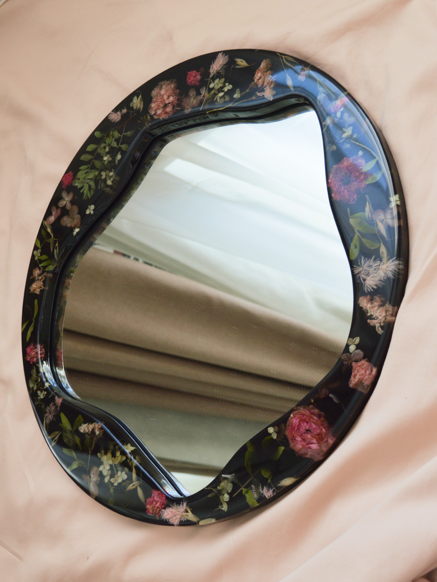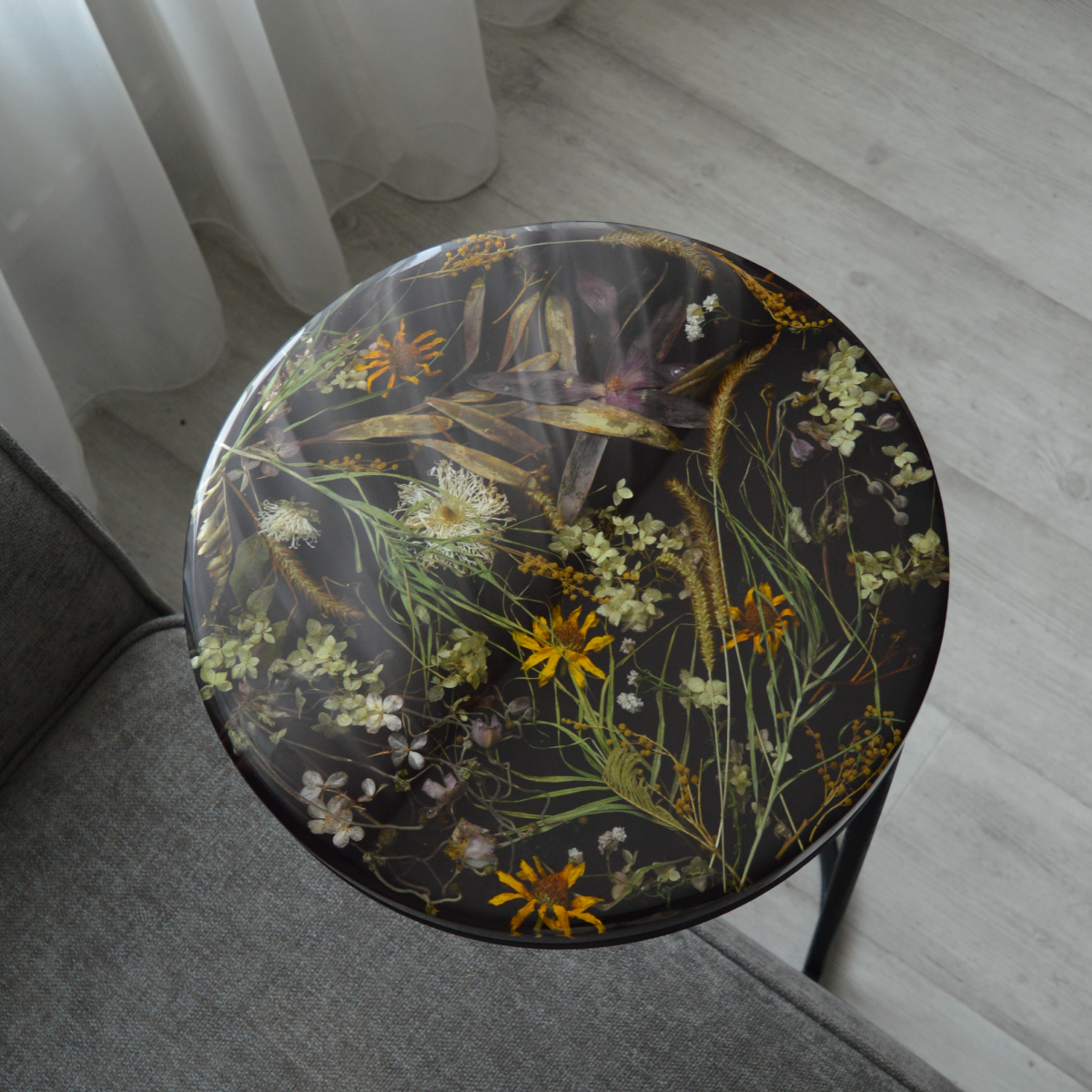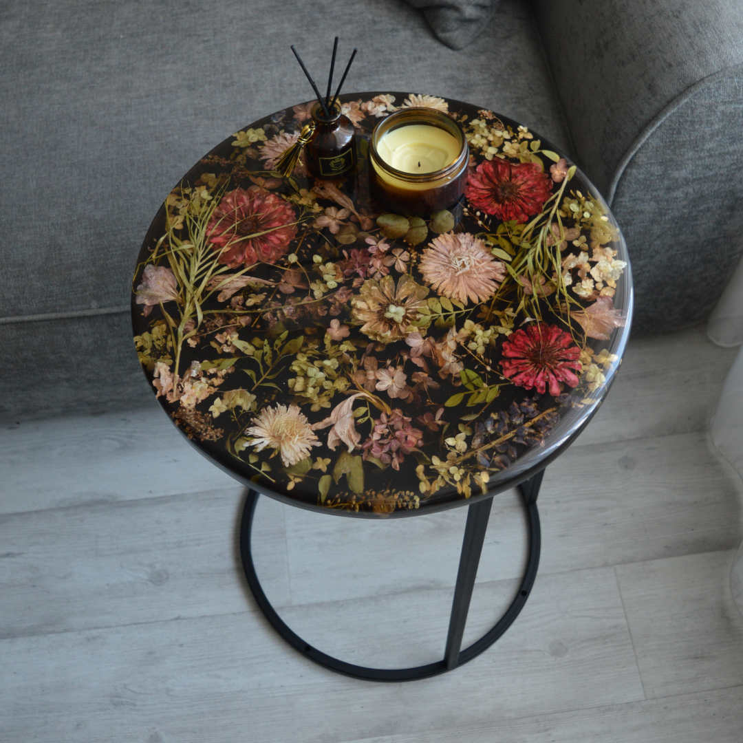 Волшебной красоты столик из эпоксидной смолы черного цвета с "рамой" из цветов. Вы можете не переживать, цветы высушены и не изменят свой внешний вид в смоле.