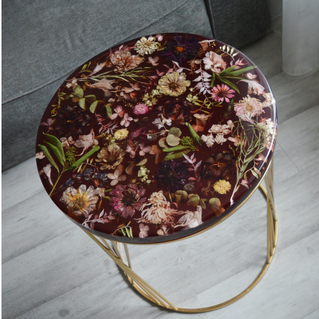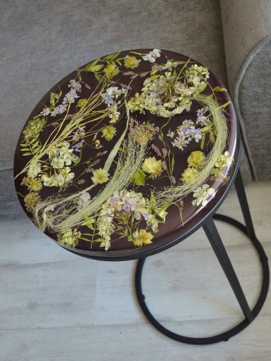 Глянцевый неповторимый столик из эпоксидной смолы с цветами внутри, словно цветочная летняя полянка в шикарном цвете бургунди. Диаметр столика 40 см. толщина столешницы 2,8 см, высота 51 см.