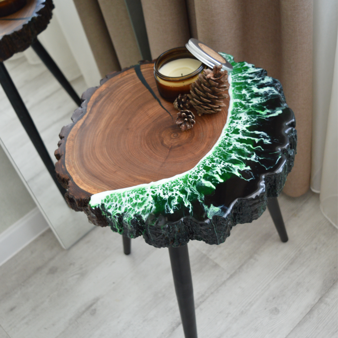 Столик из капового тополя. Неповторимая фактура дерева в сочетании с шикарным глубоким зеленым декором из эпоксидной смолы создают просто уникальный тандем. Высота столика 52 см, диаметр столешницы 46,5-48 см.