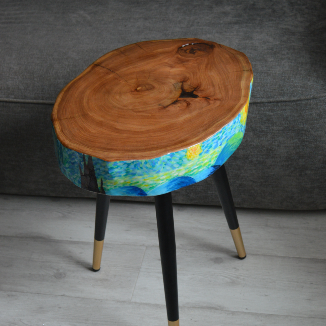 Повтор стола с росписью в стилистике Ван Гога в иной интерпретации. Высота столика 53 см, диаметр столешницы от 35 до 45 см. Толщина спила целых 8 см. Яркий и уникальный акцент для вашего интерьера.