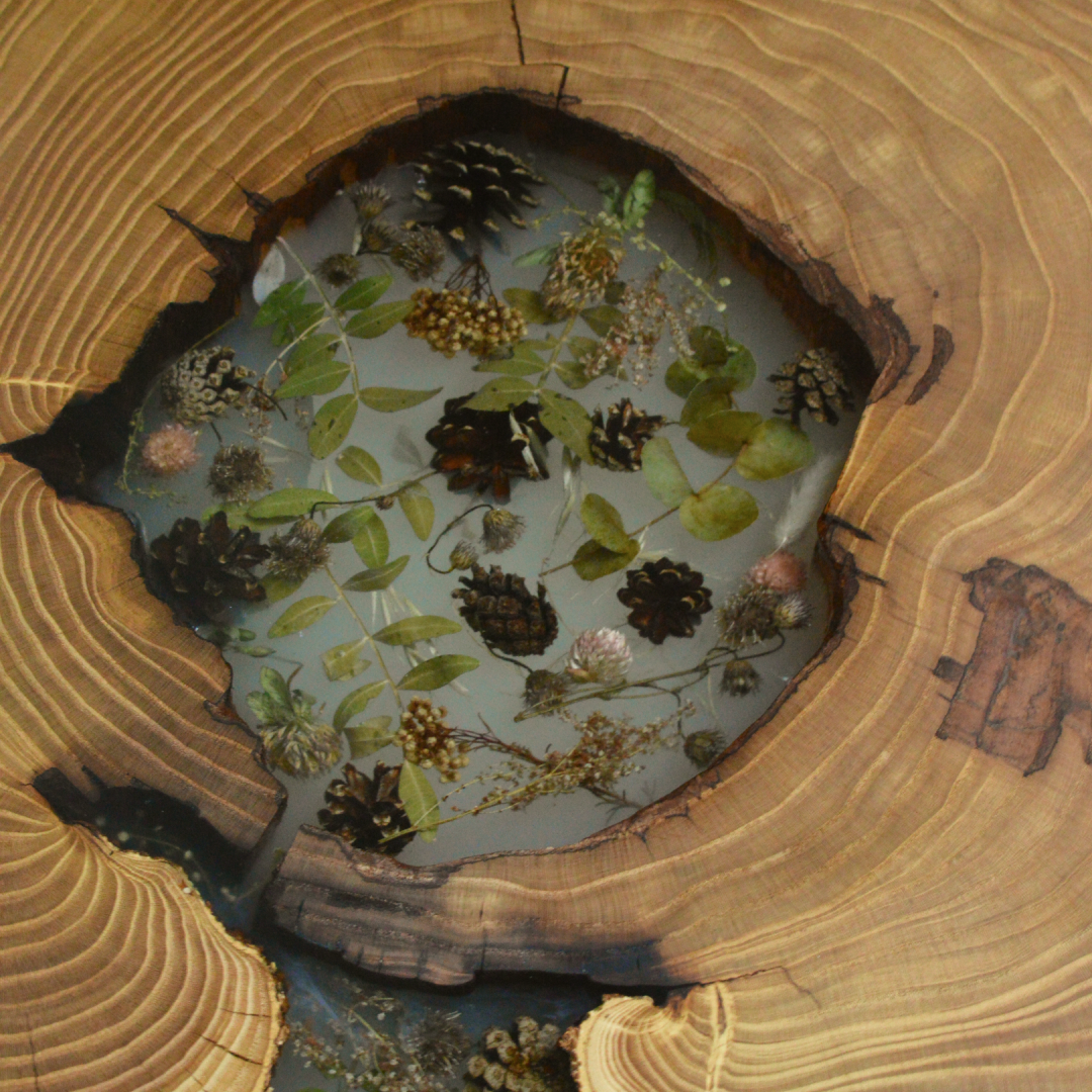 Сочетание глянцевой смолы и матового дерева. Прозрачная смола с настоящими цветами внутри легкого теплого бежевого оттенка. Диаметр 40 см, высота 47 см.